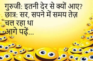 गुरुजी: प्रश्न समझ आया?छात्र: अभी पहुँच रहा है *************************************** माँ: देर क्यों हो गई?बेटा: रास्ता सोच में कट गया *************************************** मित्र: सबसे बड़ा सुख क्या है?मैं: बिना कारण की छुट्टी *************************************** पत्नी: मैं क्या हूँ तुम्हारे लिए?पति: सिरदर्द का कारण 😜 *************************************** पप्पू: पढ़ाई क्यों नहीं करता?गप्पू: किताबें मुझे देख कर डर जाती हैं