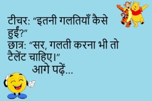 मरीज: “डॉक्टर साहब, मुझे भूलने की बीमारी हो गई है।” डॉक्टर: “कब से?” मरीज: “कब से क्या?”😊😊😊😊 ****************************************** टीचर: “इतना लेट क्यों आए?” छात्र: “सपने में सो रहा था सर, हकीकत में लेट हो गया!”😊😊😊😊 ****************************************** पप्पू: “मैंने अपनी बीवी को खूब प्यार किया।” गप्पू: “फिर?” पप्पू: “फिर बीवी ने मुझसे शादी कर ली।”😊😊😊😊 ****************************************** दोस्त: “तुम मोटे क्यों हो?” …