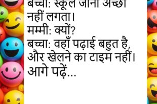 टीचर: अगर पानी नहीं हो तो?बच्चा: सर, चाय भी नहीं बनेगी।😊😊😊😊 ***************************************** लड़का: तुम मेरी जिंदगी में मिठास हो।लड़की: अच्छा!लड़का: पर मुझे भूलने वाली मिठास पसंद नहीं।😊😊😊😊 ***************************************** पप्पू: डॉक्टर साहब, मुझे नींद नहीं आती।डॉक्टर: क्यों?पप्पू: सर, रात में फोन का अलार्म बजता है।😊😊😊😊 ***************************************** पत्नी: सुनिए, मैं सुंदर हूँ या नहीं?पति: हाँ, बहुत सुंदर।पत्नी: सच में?पति: हाँ, जब मम्मी …