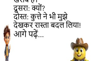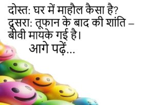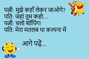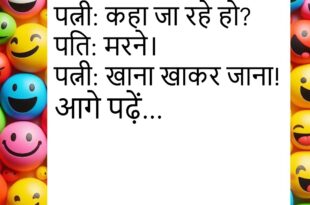 पति: आज खाने में क्या है?पत्नी: गुस्सा और चुप्पी।पति: वाह! आज कुछ नया है!😊😊😊😊 ***************************************** दोस्त: मेरी गर्लफ्रेंड मुझे छोड़ गई।दूसरा: क्यों?दोस्त: क्योंकि मैंने कहा 5 मिनिट में आता हूँ… और 2 घंटे बाद पहुँचा।😊😊😊😊 ***************************************** पत्नी: कहा जा रहे हो?पति: मरने।पत्नी: खाना खाकर जाना!😊😊😊😊 ***************************************** पप्पू: मैं रोज भगवान से 1 करोड़ मांगता हूँ।गप्पू: मिला?पप्पू: नहीं, लगता है भगवान …