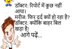 लड़की: तुम मुझसे शादी क्यों करना चाहते हो?लड़का: क्योंकि तुम सवाल बहुत पूछती हो, और मेरी आदत है चुप रहने की!😊😊😊😊 ***************************************** मरीज: डॉक्टर साहब, पेट में दर्द है।डॉक्टर: क्या खाया था?मरीज: बीवी की बातें।😊😊😊😊 ***************************************** दोस्त: घर में माहौल कैसा है?दूसरा: तूफान के बाद की शांति — बीवी मायके गई है।😊😊😊😊 ***************************************** टीचर: अगर पृथ्वी गोल है, तो हम …