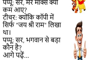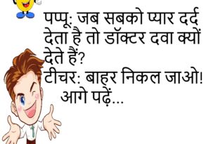 पप्पू: जब सबको प्यार दर्द देता है तो डॉक्टर दवा क्यों देते हैं? टीचर: बाहर निकल जाओ!😊😊😊😊 ***************************************** बच्चा: मम्मी, मैं बड़ा होकर गुंडा बनूंगा। मम्मी: बेटा, अच्छे घरों के लोग नेता बनते हैं!😊😊😊😊 ***************************************** टीचर: तुम रोज लेट क्यों आते हो? छात्र: क्योंकि समय से आना अच्छी आदत है, और मैं अभी बच्चा हूं।😊😊😊😊 ***************************************** पति: तुम मुझसे कितना …