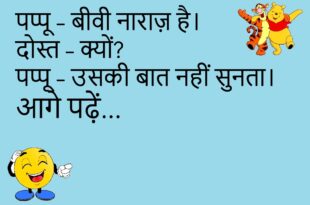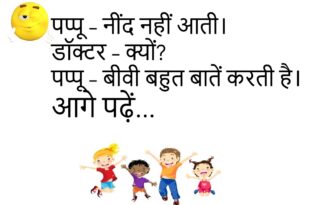 पप्पू – डॉक्टर साहब, मुझे नींद नहीं आती।डॉक्टर – क्यों?पप्पू – क्योंकि मेरी बीवी रात को बहुत बातें करती है।😊😊😊😊 *********************************** बबलू – यार, शादी के बाद इंसान बदल जाता है।पप्पू – कैसे?बबलू – पहले उसकी बीवी सुनती थी, अब बीवी ही बोलती है।😊😊😊😊 *********************************** टीचर – बच्चे, अगर तुम्हारे पास 2 आम हैं और मैं 1 ले लूँ, तो …