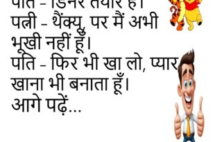 पति – तुम्हें पता है मैं तुम्हारे लिए कितनी स्ट्रेस लेता हूँ?पत्नी – हाँ, तभी तो मैं तुम्हारे लिए सब कुछ करती हूँ।😊😊😊😊 *********************************** पप्पू – मम्मी, ये रोटी बहुत सख्त है।मम्मी – बेटा, ये तुम्हारी मेहनत की तरह है, थोड़ी कड़ी।😊😊😊😊 *********************************** टीचर – बच्चों, सर्दियों में क्या पहनना चाहिए?बच्चा – टीचर, प्यार!टीचर – प्यार पहनकर सर्दी कैसे दूर …