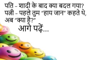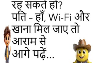 पत्नी – सुनो जी, आजकल तुम मुझे प्यार नहीं करते!पति – अरे पगली, प्यार तो बहुत करता हूँ, बस नेटवर्क कमजोर है 😜 ************************************ पत्नी – तुम मेरे बिना रह सकते हो?पति – हाँ, Wi-Fi और खाना मिल जाए तो आराम से 😁 ************************************ पत्नी – मैं कैसी लग रही हूँ?पति – कसम से, तुम तो इतनी अच्छी लग रही …