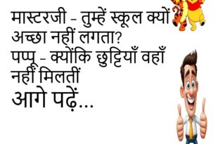टीचर – बताओ, बिजली कहाँ से आती है? पप्पू – सर, नेक्स्ट डोर से… जब उनके घर जाती है तो हमारे घर आती है! ⚡ ************************************ मास्टरजी – बच्चे, ध्यान दो! जो नहीं पढ़ेगा वो पीछे रह जाएगा!पप्पू – सर, तो फिर आप आगे क्यों बैठे हैं? 🤔 ************************************ टीचर – अगर पृथ्वी गोल है तो लोग नीचे वाले देशों …