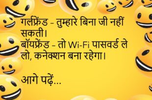 गर्लफ्रेंड – तुम मेरे लिए जान दे सकते हो? बॉयफ्रेंड – पहले नेटवर्क तो दे दो, कॉल ड्रॉप हो रहा है! 😂 ***************************************** पप्पू – मम्मी, पापा डरावने सपने क्यों देखते हैं? मम्मी – क्योंकि उन्होंने मुझसे शादी की है! 😆 ***************************************** पत्नी – सुनो, मेरी उम्र क्या लगती है? पति – कोर्ट में सच बोलने की कसम दिलाओ पहले! …