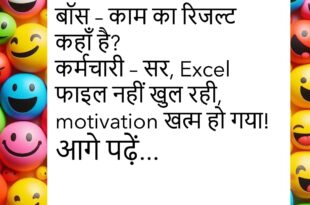 बॉस – तुम क्या कर रहे हो अभी? कर्मचारी – सर, मेहनत की acting! 😅 ***************************************** गर्लफ्रेंड – मुझे लगता है तुम बदल गए हो। बॉयफ्रेंड – हाँ, अब मैं 5G यूज़र हूँ! 😂 ***************************************** पत्नी – मुझे मेरी शादी का दिन याद है। पति – मुझे भी, वही तो था जब मेरी जिंदगी की “loading…” शुरू हुई थी! 😆 …