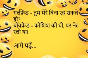 गर्लफ्रेंड – तुम मेरे बिना रह सकते हो?बॉयफ्रेंड – कोशिश की थी, पर नेट स्लो था! 📶😂 *********************************************** टीचर – बताओ, सच्चा प्यार क्या होता है?पप्पू – जब मोबाइल साइलेंट हो, फिर भी आप उसे देखते रहें! 📱💞 *********************************************** पत्नी – तुम मेरी बात क्यों नहीं सुनते?पति – क्योंकि तुम्हारा वॉल्यूम हमेशा फुल रहता है! 🔊🤣 *********************************************** डॉक्टर – तुम्हारी …
