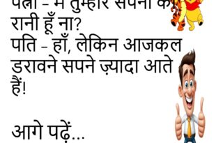 टीचर – कौन सी चीज़ फ्री में मिलती है?पप्पू – सलाह और टेंशन! 😅 *********************************************** पत्नी – मैं तुम्हारे सपनों की रानी हूँ ना?पति – हाँ, लेकिन आजकल डरावने सपने ज़्यादा आते हैं! 👑😂 *********************************************** बच्चा – पापा, शादी क्यों करते हैं लोग?पापा – ताकि दूसरे को भी समझ में आए कि गलती कैसी लगती है! 😆 *********************************************** दोस्त – …
