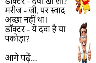 पति – आज खाना बड़ा स्वादिष्ट है। पत्नी – नाम बताऊँ? पति – हाँ। पत्नी – अगर अच्छा लगा तो “पनीर मसाला”, बुरा लगा तो “नया एक्सपेरिमेंट”।😊😊😊😊 ******************************************* टीचर – सबसे ईमानदार जानवर कौन? बच्चा – गधा, क्योंकि वो बाप का नाम नहीं भूलता!😊😊😊😊 ******************************************* पत्नी – सुनो, मुझे डिनर पर ले चलो। पति – घर का फ्री डिनर कम …