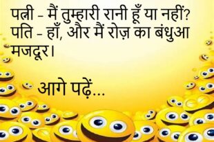 पप्पू – यार, नींद नहीं आ रही। गप्पू – फेसबुक खोल ले, पाँच मिनट में नींद आ जाएगी।😊😊😊😊 ************************************** पत्नी – मैं तुम्हारी रानी हूँ या नहीं? पति – हाँ, और मैं रोज़ का बंधुआ मजदूर।😊😊😊😊 ************************************** बच्चा – पापा, हम गरीब क्यों हैं? पापा – बेटा, क्योंकि ऑनलाइन सेल देखकर तुम्हारी मम्मी अमीर बन जाती हैं।😊😊😊😊 ************************************** टीचर – …
