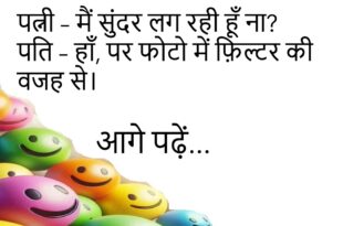 पत्नी – मुझे हीरे की अंगूठी चाहिए।पति – बिजली का बिल भर दो, घर हीरा बन जाएगा।😊😊😊😊 ******************************** डॉक्टर – क्या समस्या है?पप्पू – बीवी हर वक़्त डांटती है।डॉक्टर – ये बीमारी नहीं, किस्मत है।😊😊😊😊 ******************************** टीचर – बताओ “ATM” का मतलब क्या है?पप्पू – “At The Moment” पैसे नहीं हैं।😊😊😊😊 ******************************** पत्नी – मैं सुंदर लग रही हूँ ना?पति …