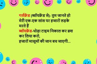 बॉयफ्रेंड- जानू मैंने आज अपना 50 लाख का बीमा करवाया है! गर्लफ्रेंड- ये तो तुमने बहुत अच्छा किया अब मुझे बार-बार कहना नहीं पड़ेगा कि अपना ख्याल रखना…😆🤣🤣🤣🤣😝😝😝 **************************************************************************************** बॉयफ्रेंड (गर्लफ्रेंड से)- डार्लिंग मुझे तुम्हारी आंखों में सारी दुनिया दिखाई देती है पीछे से एक बूढ़ा ताऊ बोला- बेटा हमारी भूरी रंग की गाय नहीं मिल रही, दिखे तो बताना…😆🤣🤣🤣🤣😝😝😝 …