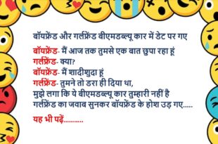 ससुर- इतना डरे हुए क्यों हो दामाद जी? दामाद- आपकी बेटी को डराने के लिए नकली छिपकली लेकर आया, तो देखा वो जिंदा सांप पकड़कर बाहर फेक रही थी…..😆🤣🤣🤣🤣😝😝😝 ************************************************************************************ सुरेश (मोहन से)- कभी किसी की हाय नहीं लेनी चाहिए मोहन- क्या हुआ? सुरेश- सुबह-सुबह पड़ोसन हाय बोल रही थी, मैने ले ली और बीवी ने देख लिया मोहन- फिर …