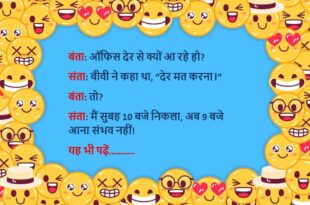 टीचर: बच्चों, बताओ “साइलेंस” का मतलब क्या होता है?पप्पू: जब मोबाइल में नेटवर्क हो और फिर भी बीवी कॉल न करे!😊😊😊 ****************************************** डॉक्टर: आपको क्या तकलीफ़ है?मरीज: बीवी के बिना नींद नहीं आती।डॉक्टर: तो फिर उसे भेज दो, मुझे भी नहीं आती! 😂 ****************************************** बॉस: तुम रोज़ देर से क्यों आते हो?कर्मचारी: सर, मेरी नींद बहुत ईमानदार है — वक्त …