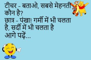टीचर – बताओ, सबसे मेहनती कौन है?छात्र – पंखा! गर्मी में भी चलता है, सर्दी में भी चलता है 😜 ************************************ पत्नी – सुनो जी, सपना आया कि आप मुझे हीरे की अंगूठी दे रहे थे!पति – अच्छा है, तो आज रात सपना पूरा कर लेना 😆 ************************************ पप्पू – डॉक्टर साहब, नींद नहीं आती!डॉक्टर – मोबाइल दूर रखो!पप्पू – …