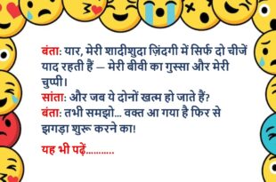 सांता: यार, मेरी बीवी ने मुझसे पूछा, “तुम मुझसे कितना प्यार करते हो?” बंता: फिर? सांता: मैंने कहा, “इतना जितना मैंने आखिरी पकोड़े खाए थे।” बंता: तो? सांता: अब तो बीवी भी मुझे पकोड़ा समझने लगी है!😆🤣🤣🤣🤣😝😝😝 ************************************************************************************ बंता: मेरी बीवी मुझसे रोज़ सवाल पूछती रहती है। सांता: क्या पूछती है? बंता: “तुम मुझे कितना याद करते हो?” सांता: और …