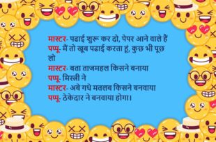 गर्लफ्रेंड- मैं अपना पर्स घर पर भूल आई, मुझे 1000 रुपये की जरूरत है। बॉयफ्रेंड- कर दी न छोटी बात, पगली यह ले 10 रुपये। अभी रिक्शा करके घर जा और पर्स ले आ। गर्लफ्रेंड बेहोश😆🤣🤣🤣🤣😝😝😝 ************************************************************************************ मास्टर- पढाई शुरू कर दो, पेपर आने वाले हैं पप्पू- मैं तो खूब पढाई करता हूं, कुछ भी पूछ लो मास्टर- बता ताजमहल …