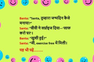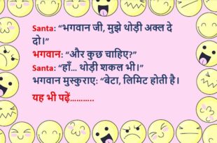 Banta: “Santa, तुम online banking कैसे करते हो?” Santa: “बहुत आसान है… सबसे पहले पासवर्ड भूल जाता हूँ, फिर OTP के लिए बीवी को परेशान करता हूँ। 😅”😆🤣🤣🤣🤣😝😝😝 ************************************************************************************ Banta: “Santa, डाइट पर क्यों हो?” Santa: “बीवी ने कहा—‘पतला दिखो’। Banta: “तो फिर क्या खा रहे हो?” Santa: “बीवी के गुस्से के ताने, जीरो कैलोरी, अनलिमिटेड मज़ा! 😂”😆🤣🤣🤣🤣😝😝😝 ************************************************************************************ Boss: …