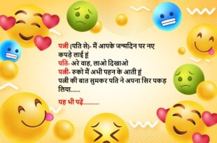 पति से लड़ाई करती पत्नी ने खाया जहर पति-पत्नी के बीच लड़ाई हुई पत्नी बाजार जाके जहर लाई और खा लिया! लेकिन वो मरी नहीं बल्कि बीमार पड़ गई पति गुस्से से बोला – 100 बार कहा है कि, चीजें देख कर खरीदा करो, अब पैसे भी गए और काम भी नहीं हुआ……😆🤣🤣🤣🤣😝😝😝 ************************************************************************************ पत्नी के मायके से वापस आते …