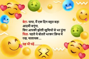 बेटी (पिता से)- मैं पड़ोसी से प्यार करती हूं और उसके साथ भाग रही हूं पिता- बहुत बढ़िया, मेरे पैसे और समय दोनों बच गए बेटी- पापा, मैं चिठ्ठी पढ़ रही हूं, जो मम्मी रख कर गई हैं बेटी की बात सुनकर पिता बेहोश…..😆🤣🤣🤣🤣😝😝😝 ************************************************************************************ पिता- क्या कर रही हो? बेटी- पढ़ रही हूं पिता- शाबास, क्या पढ़ रही हो? …