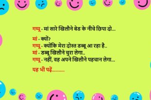 गप्पू- पता है, शादी में सबसे बड़ा धोखा कब होता है? पप्पू- कब? गप्पू- जब गाय के गुण बताकर, दूल्हे को शेरनी थमा दी जाती है……😆🤣🤣🤣🤣😝😝😝 ************************************************************************************ पप्पू- जेल को हिंदी में हवालात क्यों कहते हैं? गप्पू- क्योंकि वहां सिर्फ हवा और लात खाने को मिलती है…..😆🤣🤣🤣🤣😝😝😝 ************************************************************************************ टीचर (चिंटू से)- केले के फायदे बताओ? चिंटू- सर, केले खाने से …