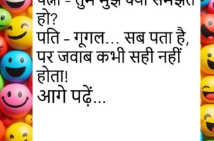 पत्नी – मेरी तारीफ़ करो! पति – तुम तो गूगल फोटो जैसी हो… रोज़ याद दिलाती हो कि मैं क्या मिस कर रहा हूँ!😊😊😊😊 *********************************************** डॉक्टर – तुम्हें दर्द कहाँ है? मरीज़ – जेब में… बिल देखकर!😊😊😊😊 *********************************************** दोस्त – भाई, तुम खुश कैसे रहते हो? दूसरा – बीवी की बातों को जोक समझ लेता हूँ!😊😊😊😊 *********************************************** पप्पू – मैं …