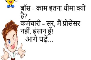 बॉस – काम इतना धीमा क्यों है? कर्मचारी – सर, मैं प्रोसेसर नहीं, इंसान हूँ!😊😊😊😊 *********************************************** पत्नी – मेरे बाल झड़ रहे हैं! पति – चलो, अब कम से कम झगड़ा करते वक्त पकड़ नहीं पाओगी!😊😊😊😊 *********************************************** पप्पू – मुझे एक ऐसी बीवी चाहिए जो गाना गाए! दोस्त – फिर तो पड़ोसी को तलाक दे दो पहले!😊😊😊😊 *********************************************** मम्मी – …