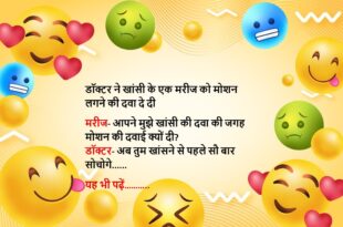 लड़की (लड़के से)- कल मैं तुम्हारे लिए राखी लेकर आई थी, तुमने क्यों नहीं बंधवाई? लड़का- अगर मैं तेरे लिए मंगलसूत्र लेकर आऊं, तो तुम बंधवा लोगी क्या? लड़की की बोलती हो गयी बंद…..😆🤣🤣🤣🤣😝😝😝 ************************************************************************************ पति-पत्नी को मूवी देखने जाना था घर के बाहर पति काफी देर से इंतजार कर रहा था, पति (चिल्लाते हुए)- अरे और कितनी देर लगाओगी? …