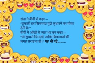 संता खेत में बैल चरवा रहा था, बंता आया — बंता: यार, ये बैल इतना शांत क्यों है? संता: वो सोच रहा है कि घर की माँ के हाथों का खाना कब खाएगा। बंता: वही तो… जब माँ का खाना खा लोगे, बैल भी ना कुछ कहे।😆🤣🤣🤣🤣😝😝😝 ************************************************************************************ संता अपॉइंटमेंट पर गया डॉक्टर के पास — संता: डॉक्टर साहब, नींद …
