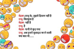 सुरेश (बॉस से)- सर मेरी पत्नी 5-6 दिनों के लिए मेरे साथ कहीं घूमने जाना चाहती है, मुझे छुट्टी चाहिए बॉस- नहीं मिलेगी सुरेश- थैंक्यू सर, मैं जानता था कि मुसीबत में आप ही मेरे काम आएंगे……😆🤣🤣🤣🤣😝😝😝 ************************************************************************************ मेढक (राजू से)- तुझमें दिमाग नहीं है राजू- बिलकुल है मेढक- नहीं है राजू- है मेढक- पानी में कूद गया राजू- अब …