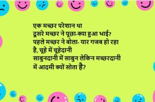 मालिक – तुमने उस कारखाने में कितने दिन काम किया है ? नौकर – साहेब 50 साल। मालिक — तुम्हारी उम्र क्या है ? नौकर – मेरी 30 साल। मालिक — जब तुम्हारी उम्र 30 साल की है फिर 50 साल काम किस प्रकार किया। नौकर – उस कारखाने में ओवर टाइम बहुत होता है।😆🤣🤣🤣🤣😝😝😝 ****************************************************************************************** आत्महत्या के लिए पटरी …