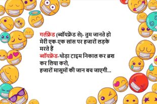 लड़का- तुम्हें मेरे अंदर सबसे अच्छी बात क्या लगती है? लड़की- लोग समय के साथ बदल जाते हैं, पर तुम नहीं बदले। लड़का- वो कैसे? लड़की- जब मैं तुमसे मिली थी तब भी तुम बेरोजगार थे और आज भी बेरोजगार हो।😆🤣🤣🤣🤣😝😝😝 ************************************************************************************** गर्लफ्रेंड ने अचानक ही लड़के को थप्पड़ जड़ दिया बॉयफ्रेंड तिलमिला उठा और पूछा- मैंने क्या गलती की? …